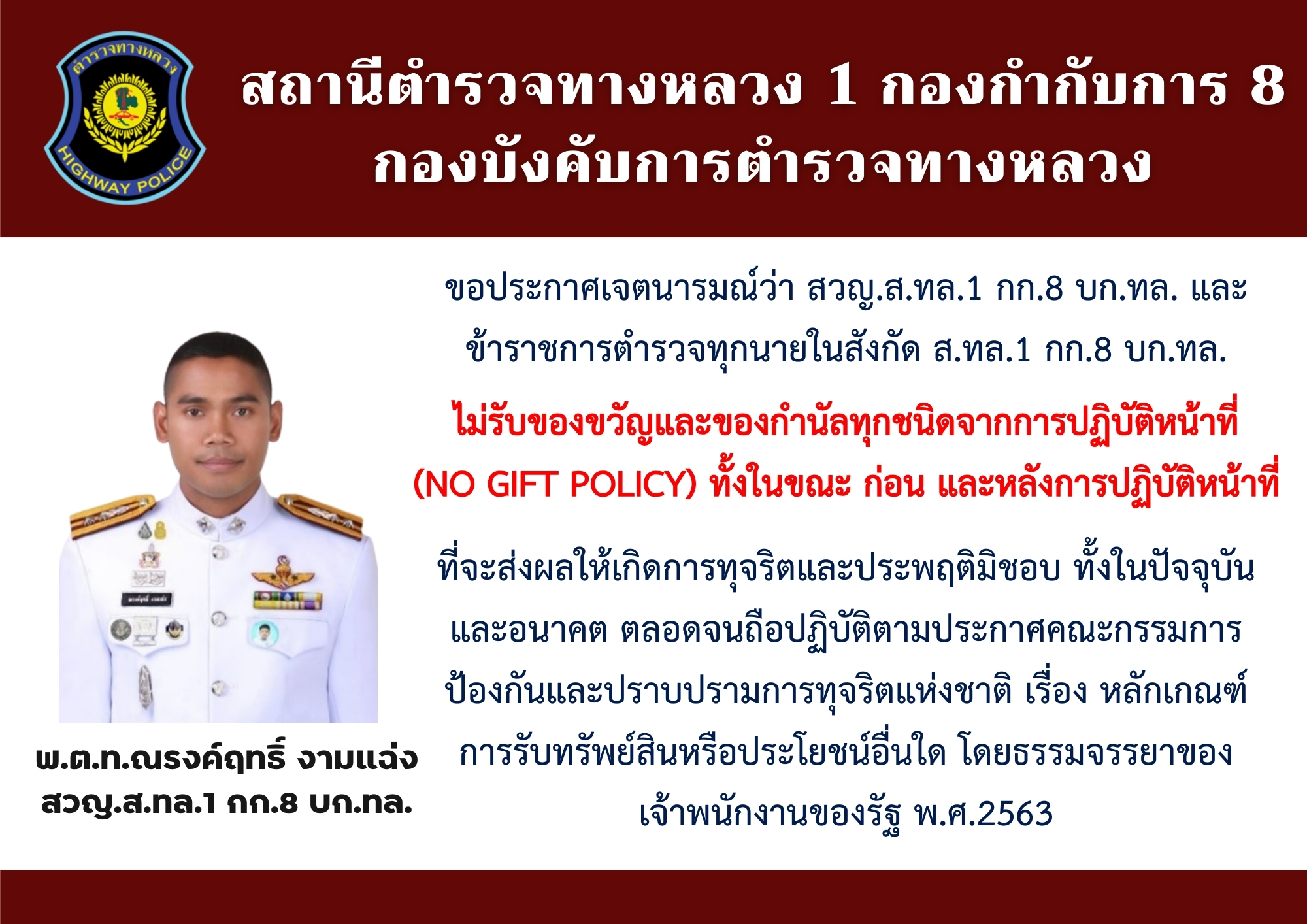สวญ.ส.ทล.1 กก.8 บก.ทล. ได้ออกประกาศนโยบายต่อต้านการรับสินบน (Anti-Bribery Policy) เมื่อวันที่ 28 ธัน